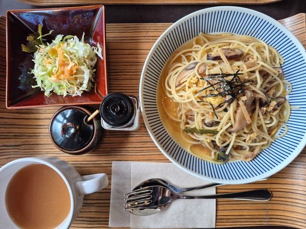 パスタはボリューミーで、湯気とともに鰹節と出汁の良い香りが立ち込めます。椎茸は噛むほどに旨みが広がり、麺とよくなじんだタケノコが心地よい食感のアクセントになっていました。