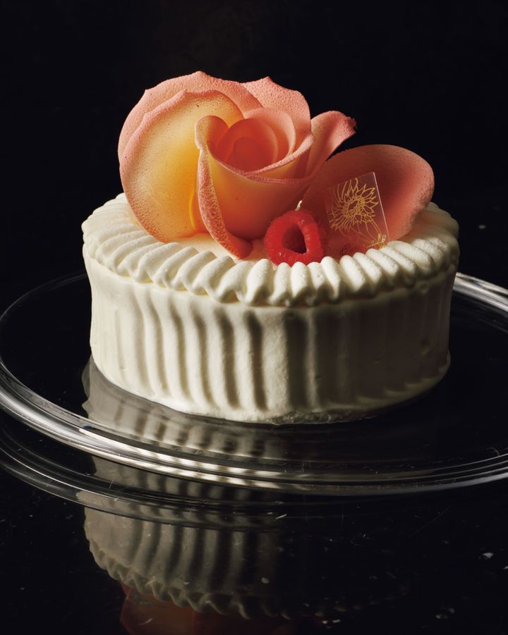 バランスを追求し、口溶けよくふんわり、風味豊かに仕上げたイチゴのショートケーキに、職人技が光る美しくエレガントなチョコレート細工のバラをのせて。