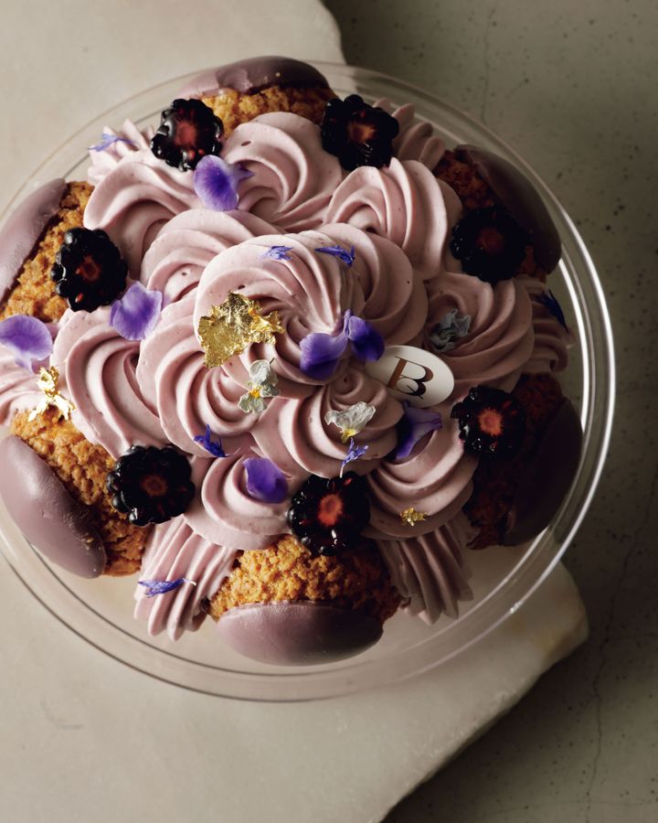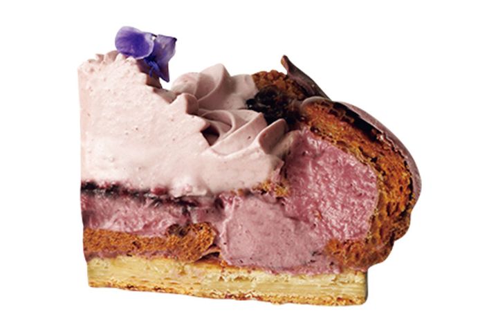 ブラックベリーとカシスを合わせた2種のクリームが味わいの濃淡を成す、シックで華やかなサントノーレ。ブルーベリーのコンフィチュールがアクセント。