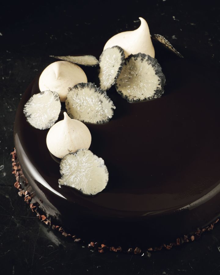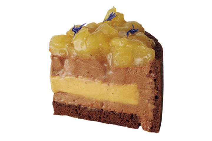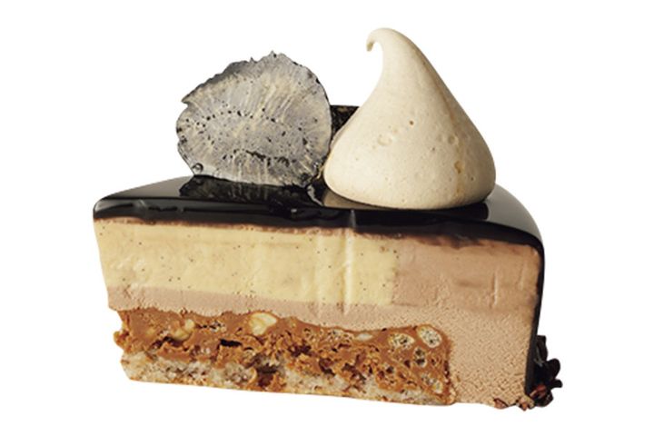 黒トリュフが香るビターチョコレートムースの深みと、バニラのクレーム・ブリュレの芳しさ、プラリネの甘さが贅沢に調和。