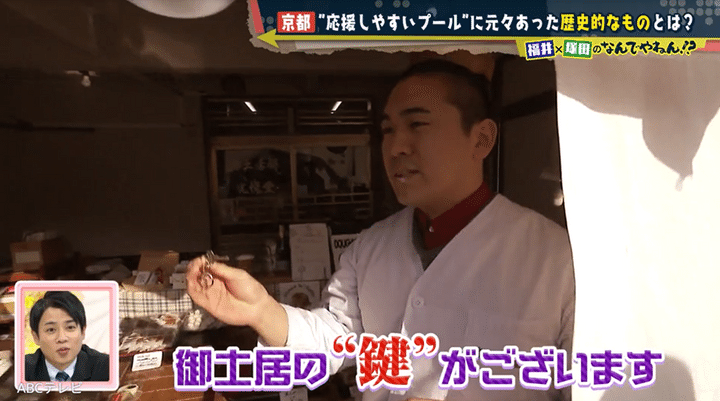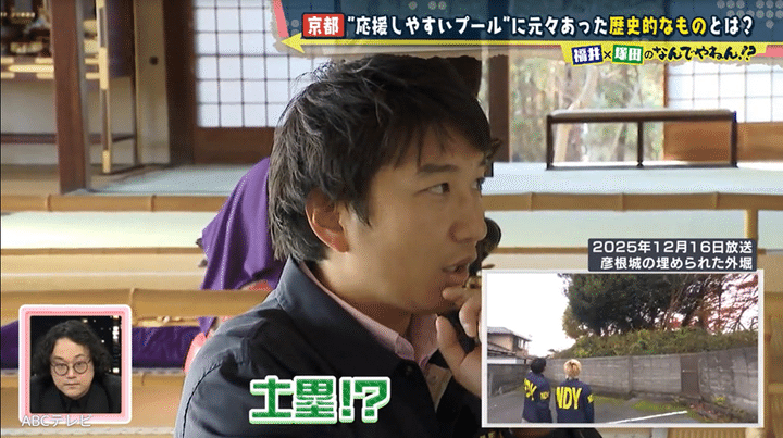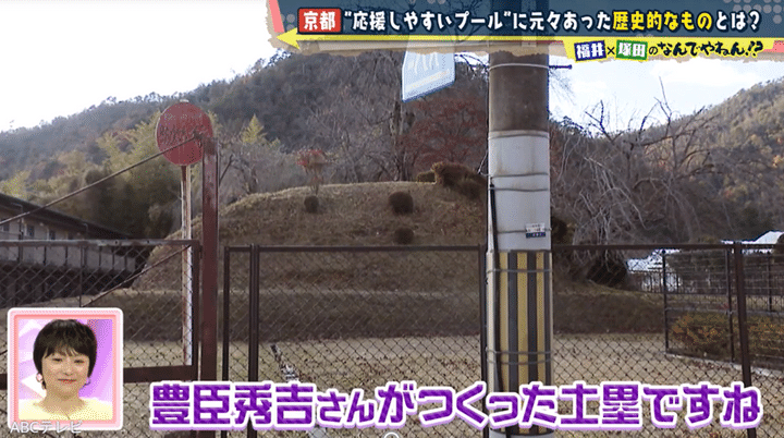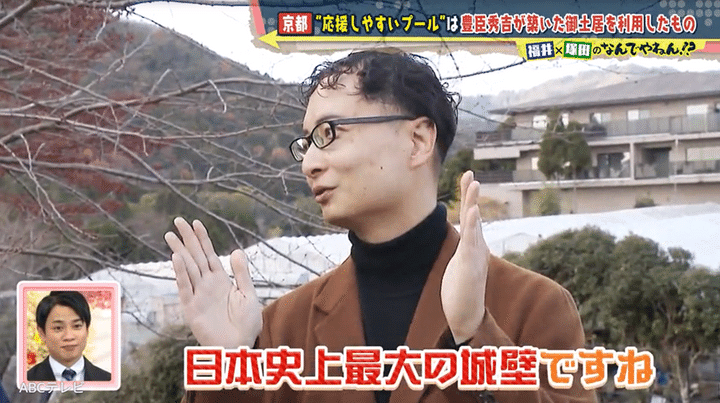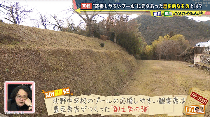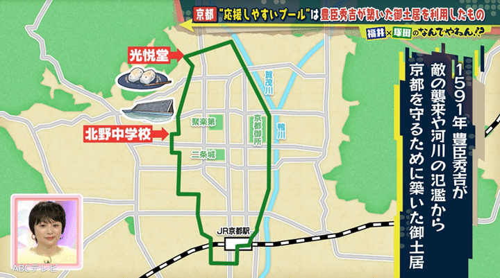 福井アナと塚田の推理の結果は、100点満点中……見事に100点! 秀吉が御土居をつくったのは、敵の襲来や河川の氾濫から京都を守るためだ。以倉さんによると御土居は、なんと江戸城の総構えより広い全長約22.5キロもあり、「日本史上最大の城壁」だったのだとか。その斜面と堀を利用して50メートルプールと観客席ができ、北野中学校に引き継がれている、というわけだった。