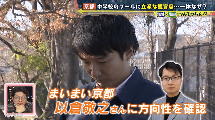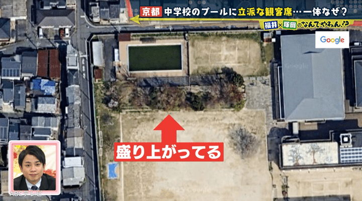 めっちゃ応援しやすいプールがあるのは、北野天満宮からほど近い京都市立北野中学校。プールの前にはなぜか大きすぎる観客席があり、隣のテニスコートまで続いている。観客席とグランドの間にある、こんもりと盛り上がった丘も謎だ。中学校に設置するには立派すぎる観客席を、福井アナは「北野中学校ができる前にあった施設の名残り」と推測。学校が戦後にできたという歴史から、戦争が関係していると考えたが、その予想は外れた。