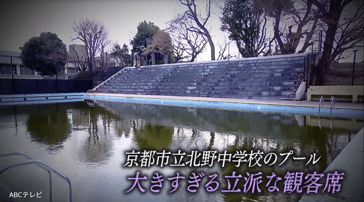 実は北野中学校ができる前の大正15年に、ここには京都府初の50メートルプールがあった! 京都のミニツアー・まいまい京都代表の以倉敬之さんいわく、「全日本大会とか日米対抗の大会が開かれた、非常に立派なもん」で、「あの観覧席は当時のものの名残」。「実はもともとそこに歴史的なものがあったから、プールと観客席が造られた」という。