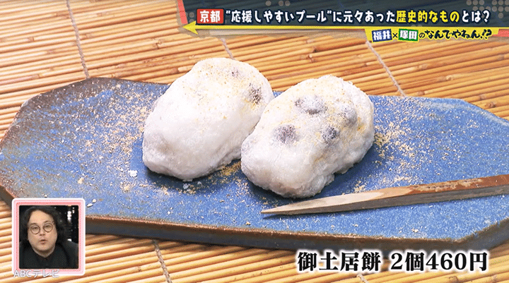 そこで福井アナと塚田は、鷹峯を徹底調査し、「御土居餅(おどいもち)」という豆大福が名物の和菓子店・都本舗 光悦堂に辿り着いた。光悦堂の店主によると御土居餅の「御土居」とは、天下人・豊臣秀吉がつくった土塁のこと! その御土居はお店の目の前にあり、現在は店主が管理をまかされている。