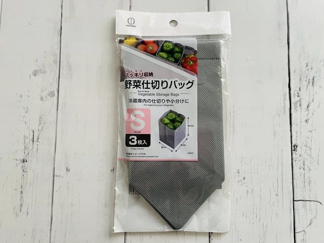 冷蔵庫内での野菜保存や整理に便利なのが、ダイソーの「野菜仕切りバッグ」。仕切り・小分け・立て収納がこれひとつで叶うアイテムです。