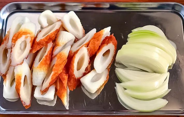 ちくわは1cm幅の斜め切り、タマネギは8mm幅程度に切りましょう。