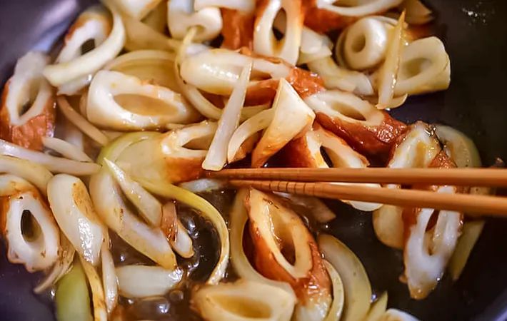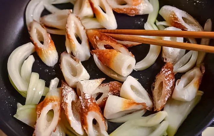 3.タマネギとちくわを炒める