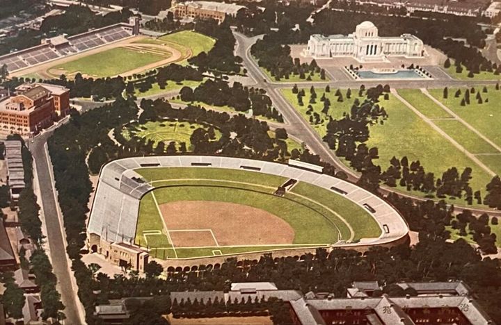 戦前の明治神宮外苑。手前が野球場、右手奥が聖徳記念絵画館。※絵葉書、筆者所蔵