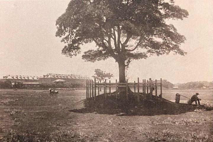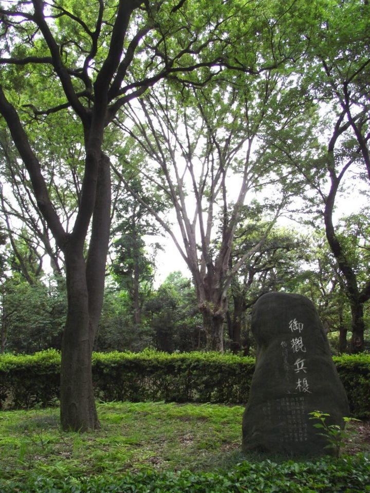 明治天皇が閲兵した場所にある石碑と「御観兵榎」。