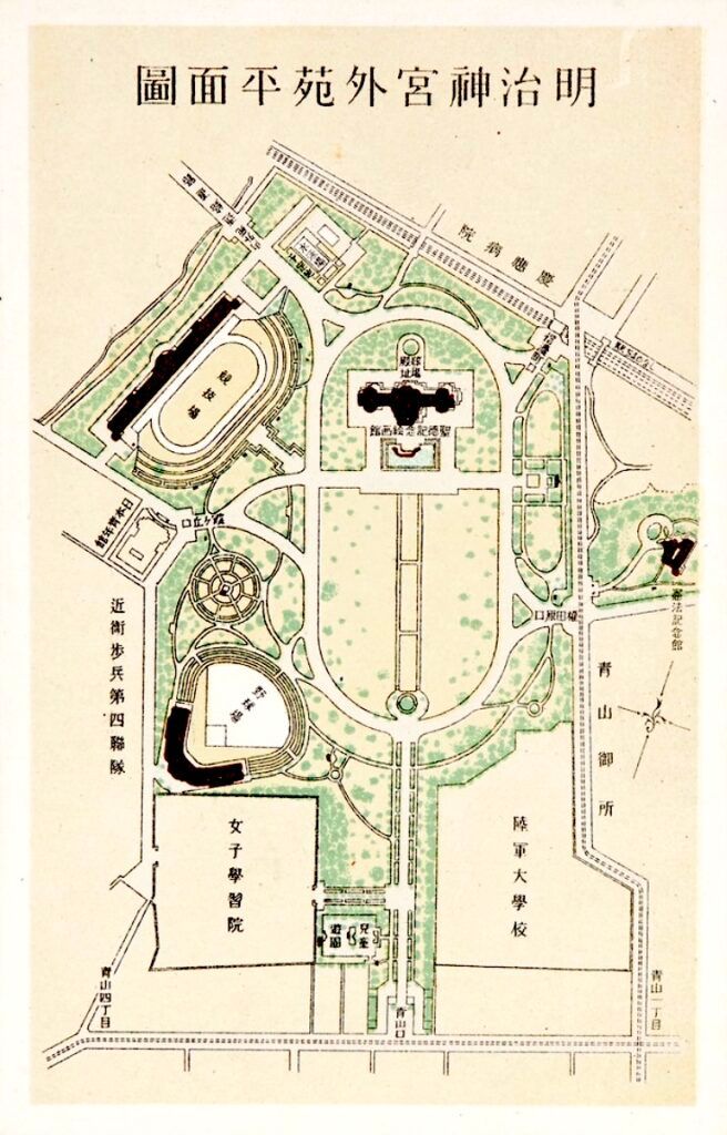 竣工時の明治神宮外苑の平面図。※絵葉書、筆者所蔵