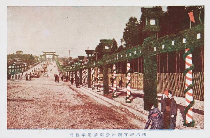 鎮座祭時の明治神宮内苑の南参道と奉祝門。※絵葉書、筆者所蔵