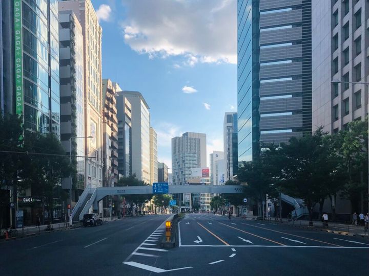 青山通り。1964年のオリンピックの際に拡幅され、現在はオフィスビルや商業ビルが建ち並ぶ。