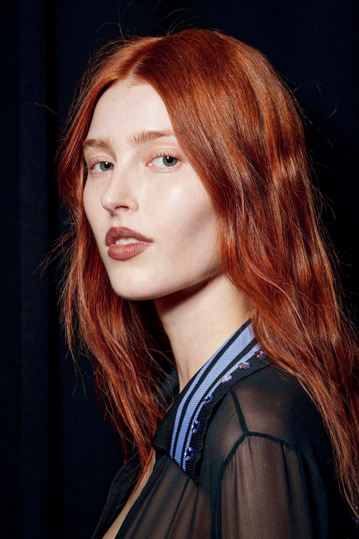 日焼け感メイクは、おでこまで▶ピーチ、コーラルなど、太陽の熱感を宿したフェイスカラーを、シックで統一感のあるルックスに落とし込むためのティップスをランウェイで発見。いつものチークゾーンに加えて入れるべきポイントは、おでこ、鼻先、あご先などのいわゆるハイライトゾーン。生っぽさのあるテクスチャーでフレッシュに仕上げて。