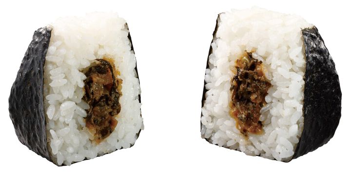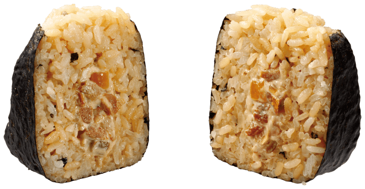 マヨネーズで和えたチャーシューを、甘辛い醤油たれをまぶしたごはんで包み、味のアクセントに刻み海苔をごはんに混ぜています。