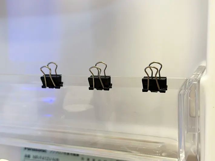 次に、冷蔵庫のドアポケットに、小さいほうのダブルクリップを等間隔で挟みます。