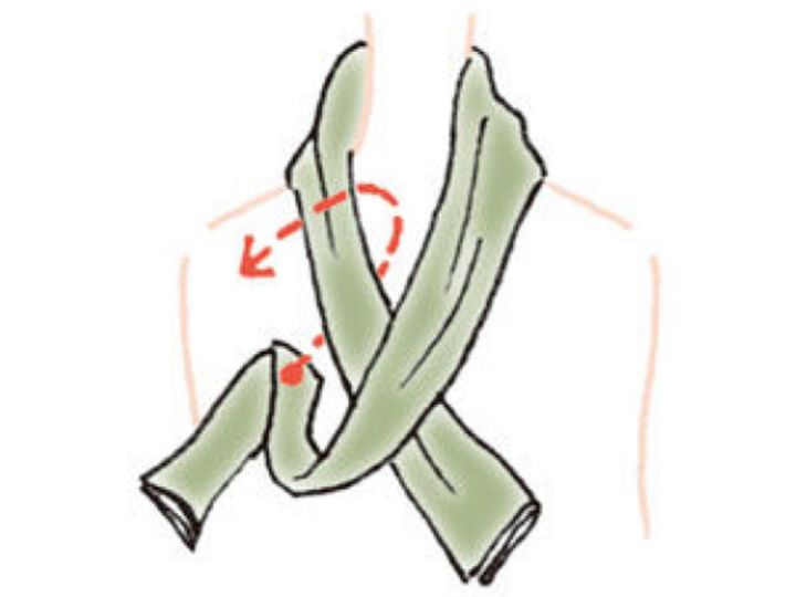 【2】スカーフを首にかけ、一方を長めにして上から交差させ、輪を作って短いほうの下からくぐらせる。