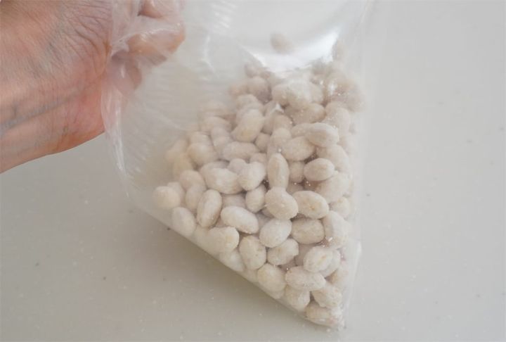 ビニール袋に大豆と片栗粉を入れたら、袋を膨らませて口を縛りシャカシャカ振りましょう♪