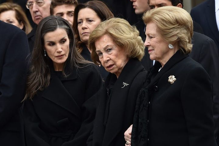 ソフィア前王妃(中央)を気遣う様子のレティシア王妃(左)と前王妃の義理の妹アンナ=マリア元王妃(右)