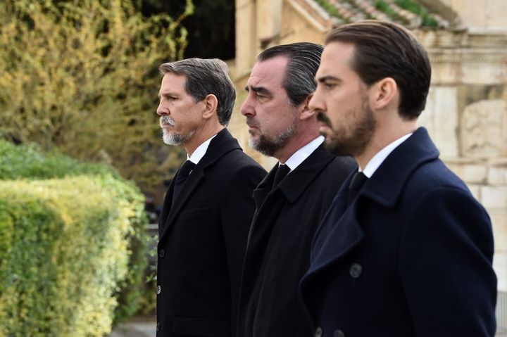 タトイ宮殿の敷地内にある王家の墓所で、棺を前に並ぶ(右から)パウロス元王太子、ニコラオス王子、アレクシア王女