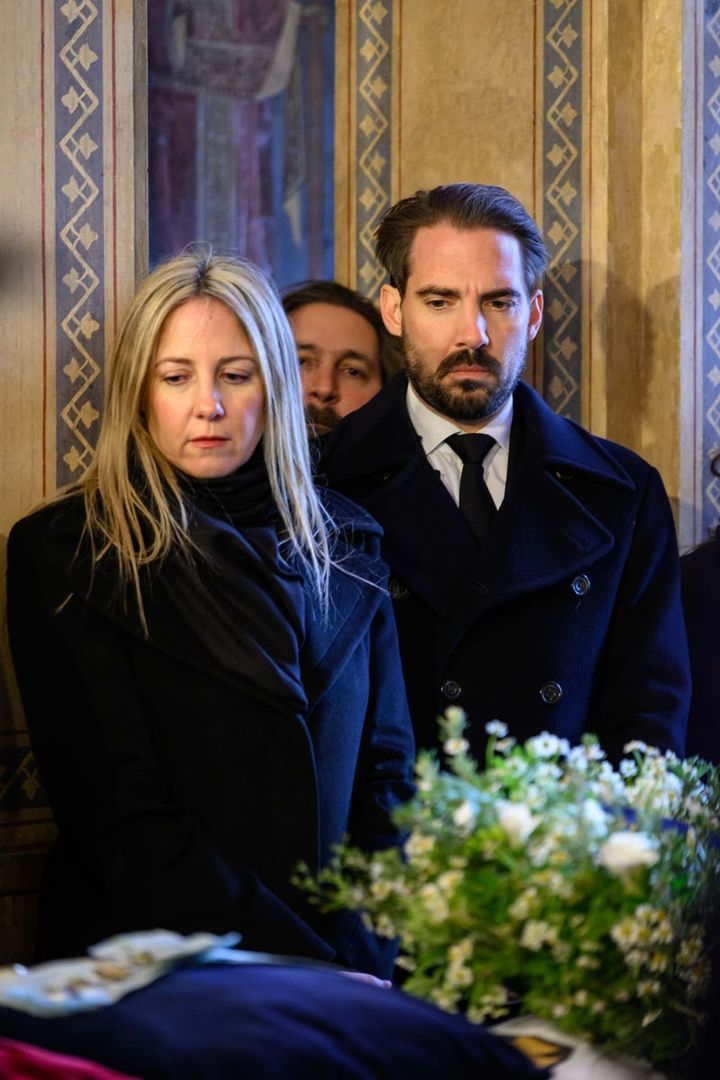 ギリシャ国旗に包まれた棺の前に座る(左から)アンナ=マリア元王妃、パウロス元王太子、(王太子の長男)コンスタンティノス=アレクシオス王子、アレクシア王女