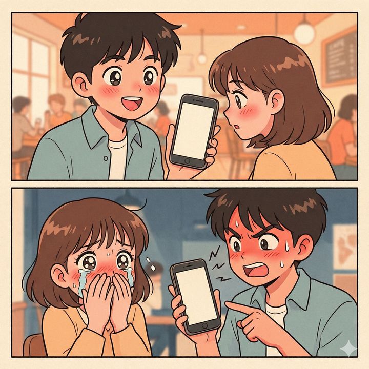 賑やかな店内で、彼は突然「ねえ、これ見てよ!」とスマホを差し出してきました。