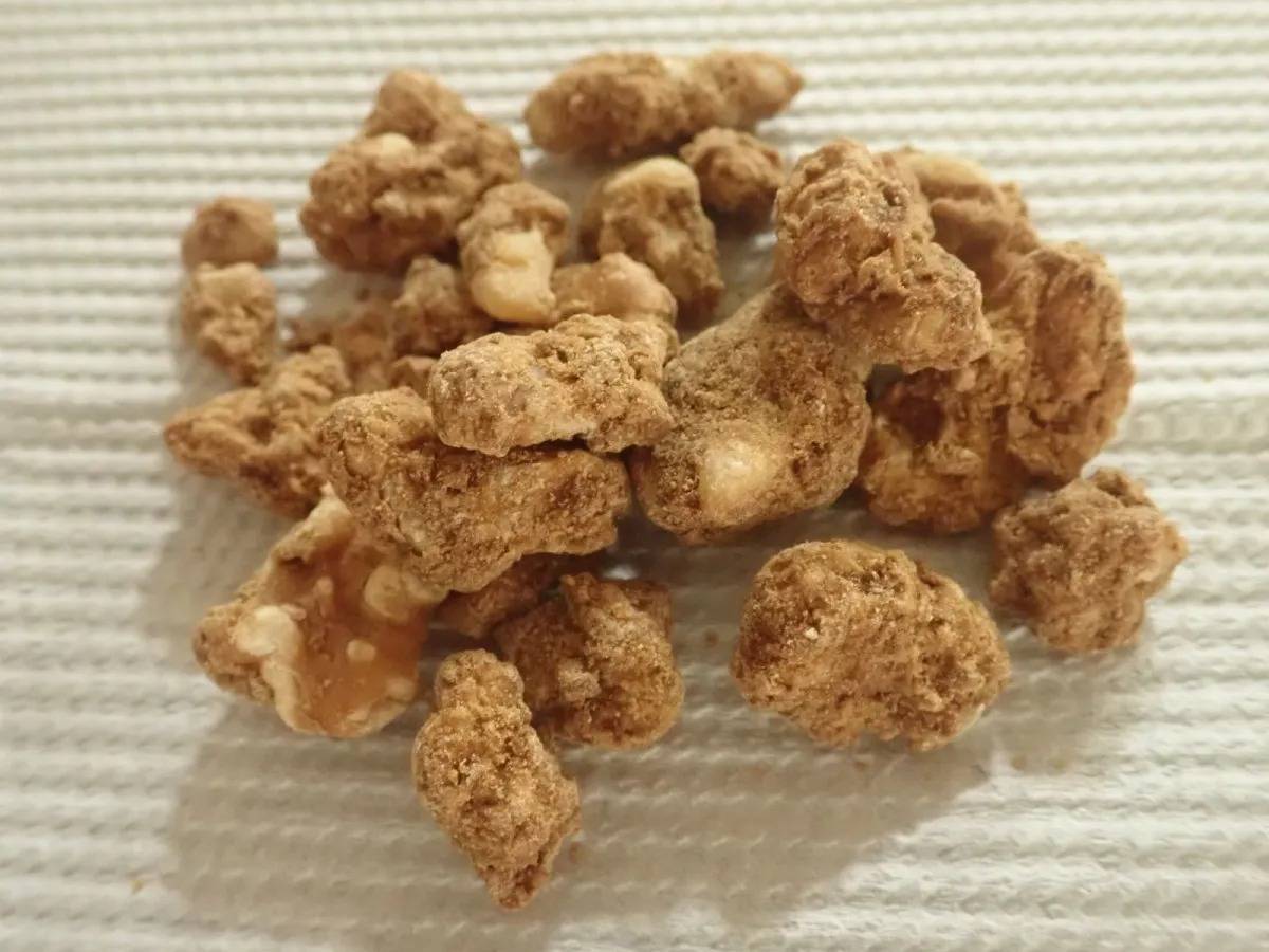 DAISO(ダイソー)の「くるみ黒糖 30g」は、くるみの表面に沖縄産の黒糖をまぶしたお菓子です。