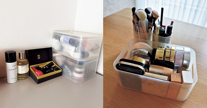 「アクリルケースはコスメ仕分けにはピッタリ。クリアだから目に見えてアイテムもわかりやすく、定期的に整理整頓するのが好きなのでとても使いやすいです。いつもカテゴリーごとに分けて収納しています。重ねて2段にしたり、いろいろ組合せを工夫できたりするのもいい!」(新居芙美恵さん/31歳・アパレル関係)