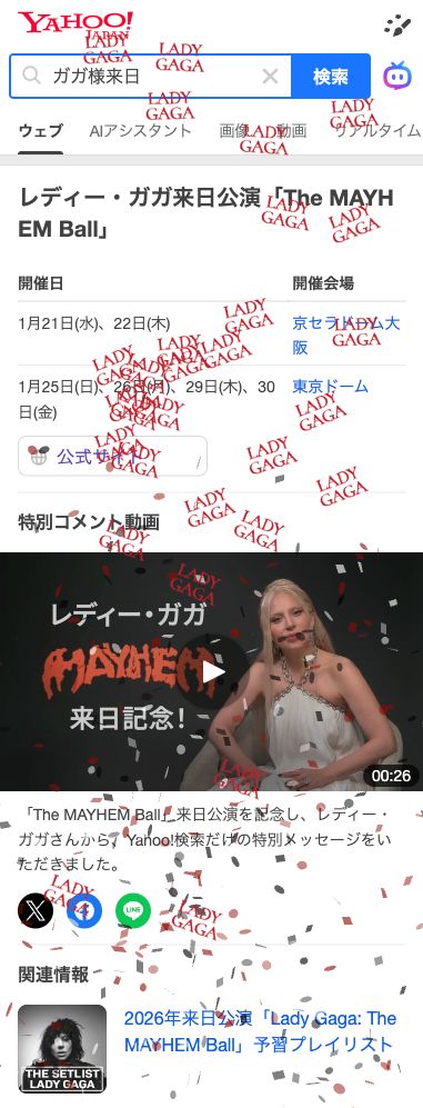 そんなガガの来日を祝う形で、Yahoo!検索が粋なキャンペーンをスタートさせた。期間は1月21日から2月4日まで。「レディー・ガガ」「Lady Gaga」「ガガ様来日」などの関連ワードをYahoo!検索で入力すると、通常の検索結果とは異なる特別な演出が表示される仕組みだ。検索するだけで参加できる気軽さもあり、ファンの間で話題になっている。