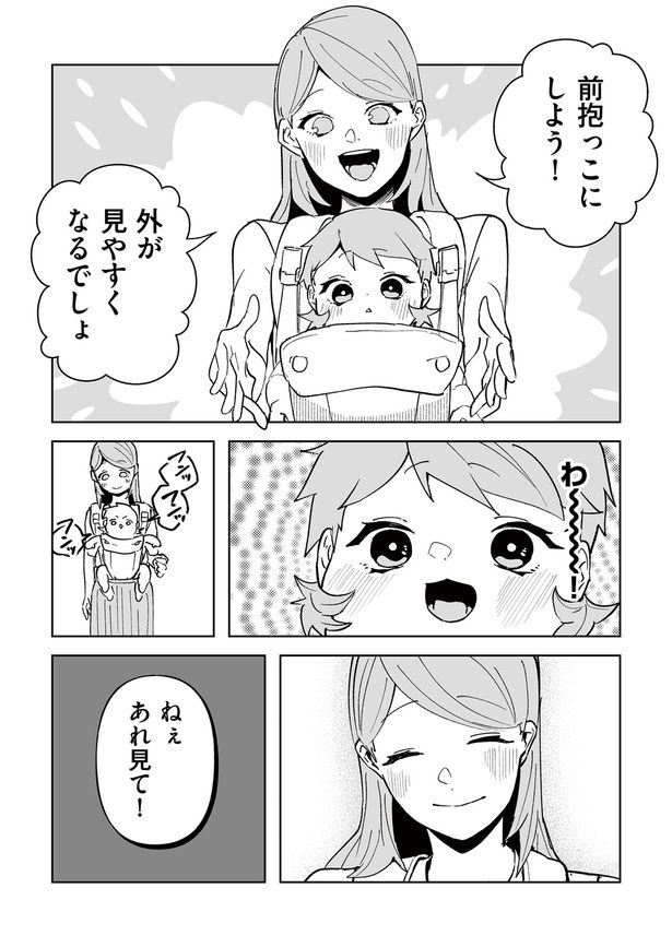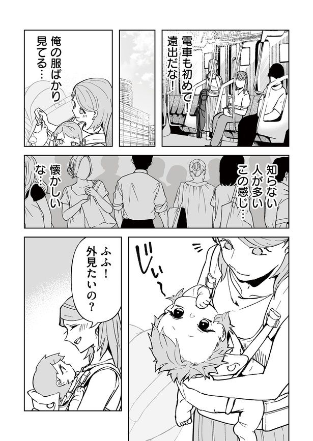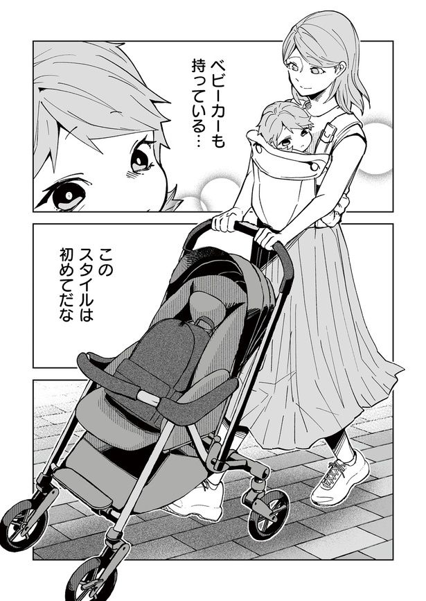 机の脚をなめたり、天板に手を伸ばしたりと、一人遊びする赤ちゃん(転生者・和史)。一方、ママさんは抱っこ紐の準備をしており、お出かけに誘われて…!?