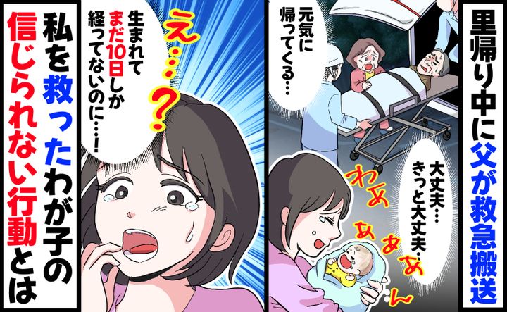 里帰り中に父が救急搬送。不安で生後10日のわが子と泣く私…え!?私を救ったわが子の驚きの行動とは