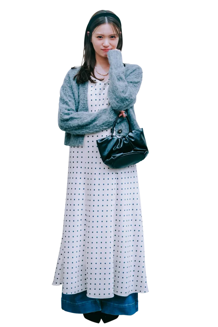 フレアーデニムパンツは着回し。 ニットカーディガン(ニットカーディガンとビスチエのセット)23,980円/LILY BROWN ドット柄キャミワンピース 14,300円/Ungrid カチューシャ 14,300円/THE HAIR BAR TOKYO パールネックレス 2,090円/アネモネ(サンポークリエイト)レザーバッグ 2,990円/神戸レタス ミュール 9,900円/チャールズ&キース(チャールズ&キース ジャパン)