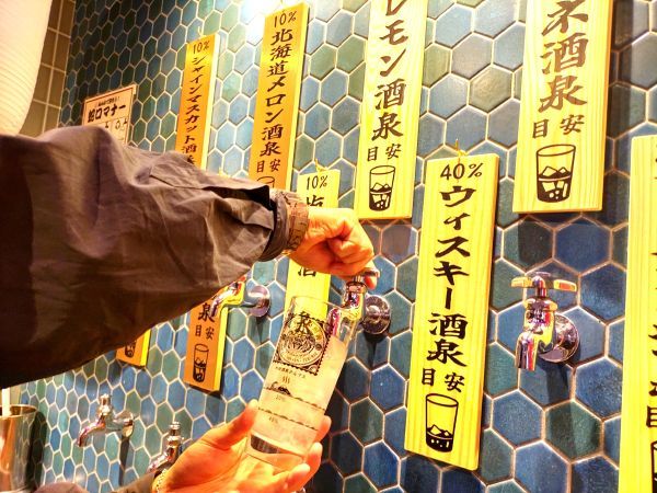 「大衆酒泉テルマエ」の最大の目玉は、蛇口から注ぐセルフ「酒泉飲み放題」です。