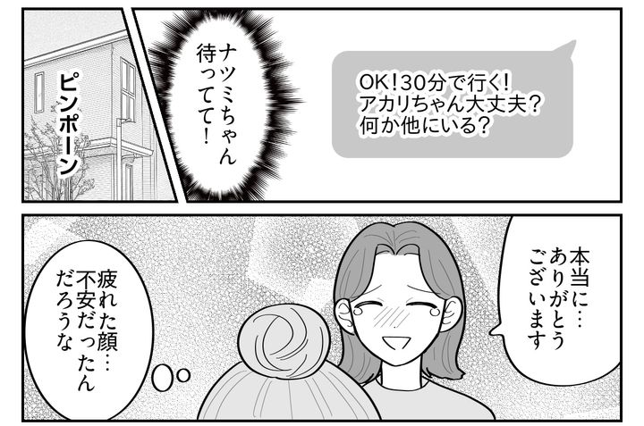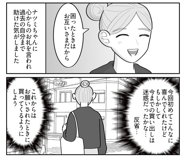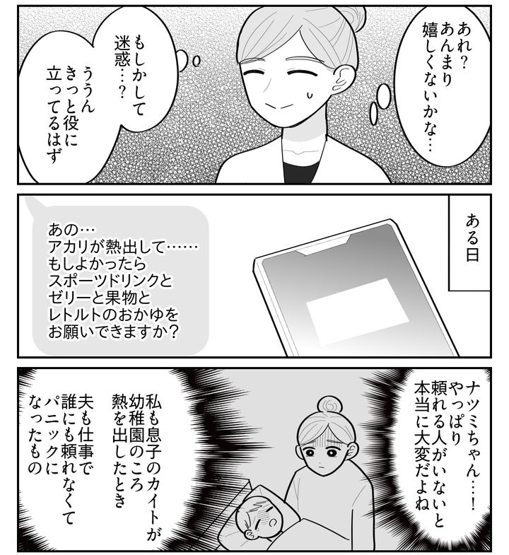 頼れる人がいないナツミちゃんは、きっと心細かったのでしょう。私が頼まれた買い物をして持っていくと、心からホッとしたような顔で何度も何度もお礼を言ってくれました。こんなに喜んでもらえたのは初めてです。ということは、今までは……?