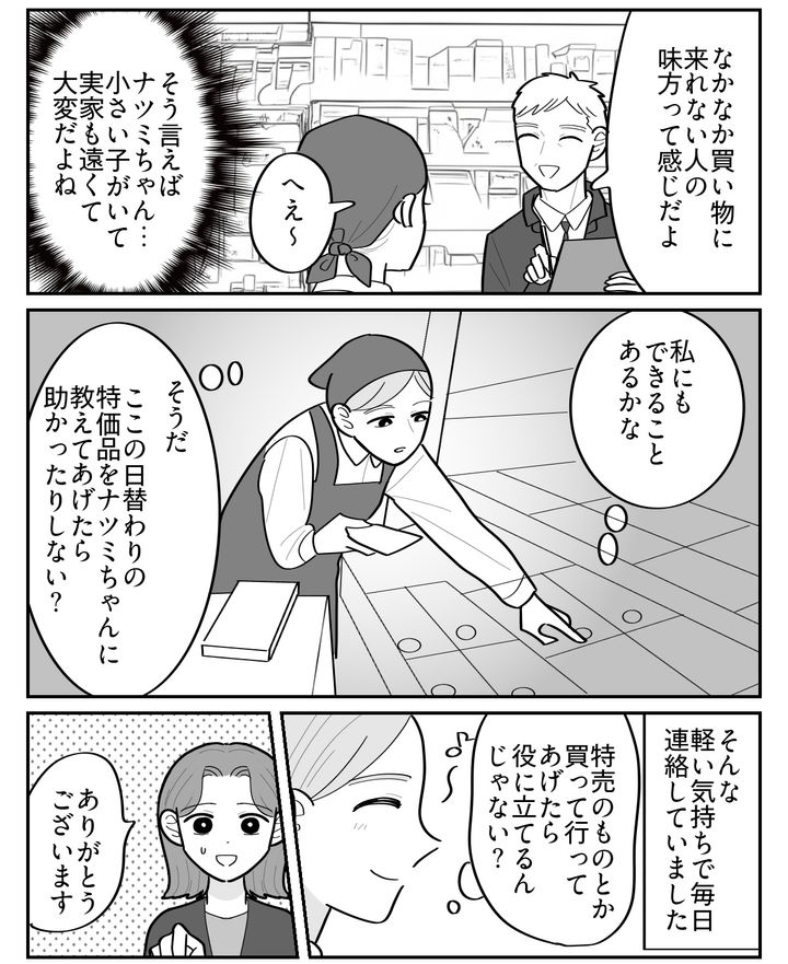スーパーで働いていると特売のサイクルを覚えるし、毎日の安売りの情報も入ってきます。私はそれを軽い気持ちでナツミちゃんに連絡していました。言われなくても買っておいてあげたら、もっと楽になるんじゃないかとも思いました。