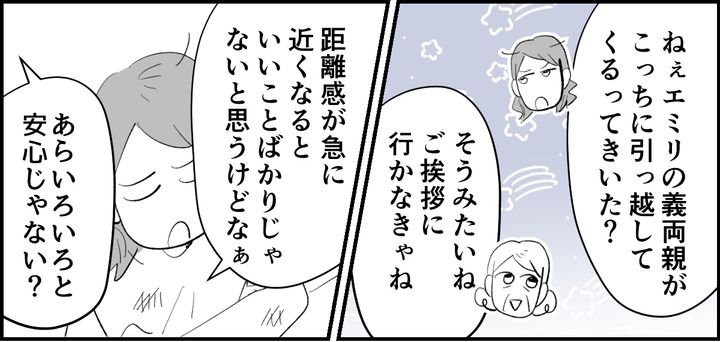 なんとエミリの義両親が、この近所に引っ越してくるそうです。「頼れる人は多いに越したことない」と、あまりにも能天気に話すエミリ。物理的な距離が近すぎても気をつかうと思うのですが……そう私が心配すると「お姉ちゃんは、神経質すぎ~」と、一蹴されたのでした。