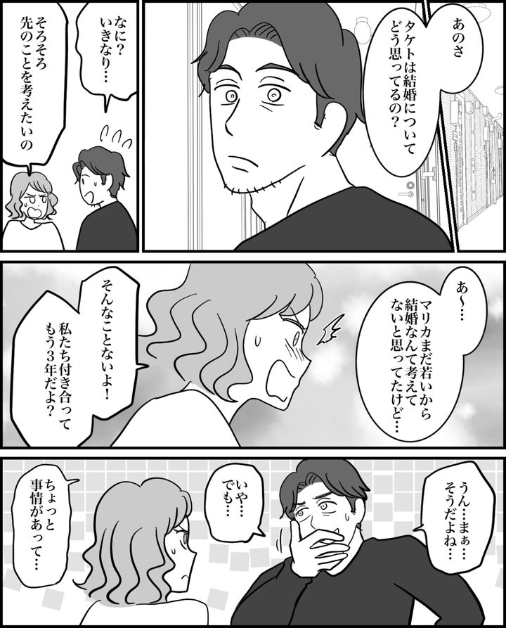 私はマリカ。今から3年ほど前、私は1人暮らしの会社員でした。ちょうどまわりが結婚ラッシュで、毎月のように結婚式の招待や出産報告などが届いていました。私ももうじき30歳を迎えるというタイミングだったので、早く結婚したいと思って焦りはじめたのです。付き合っているタケトは10歳年上ですが、結婚の話を持ち出されたことは一度もなく……。思い切って私の方から「そろそろ先のことを考えたい」と話を切り出すことにしました。