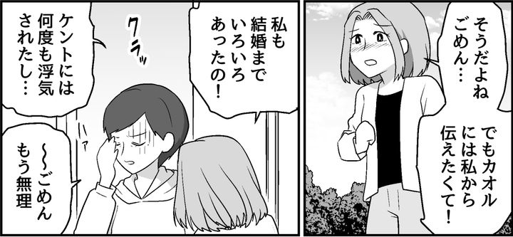 エイコには家の玄関先でさめざめと泣かれてしまいました。「ごめん、でもカオルにはケントのことを人づてに知られるんじゃなくて、私から直接伝えたくて。私も結婚にたどりつくまでいろいろあったの、ケントには何度も浮気されたし……」