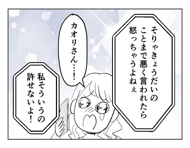 カオリさんは明るくさっぱりした人ですが、人を傷つけるやつは許せないという正義感の強い人。だからこそセリナさんと気が合い、たまにしか会えないながらもとても仲がいいのかもしれません。そんなカオリさんは、セリナさんの話を聞いて怒りを覚え、何かちょっとしたいたずらを思いついたようです。おそらく「楽しいこと」をする相手はセリナさんの義両親だと思いますが……いったい何をするのでしょうか? 気になりますね。