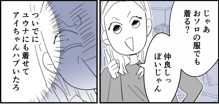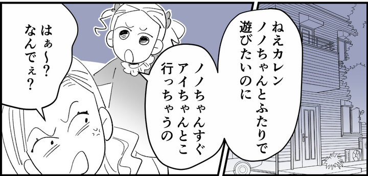 娘のカレンはノノちゃんが大好き。でも、2人で遊びたくてもいつもノノちゃんはアイちゃんのところに行ってしまう……と、悲しむ娘の顔を見て、ふと思いついたことがありました。子どもたちにお揃いの洋服を着させて、アミさんちだけ意図的にハブいてやることにしたのです。