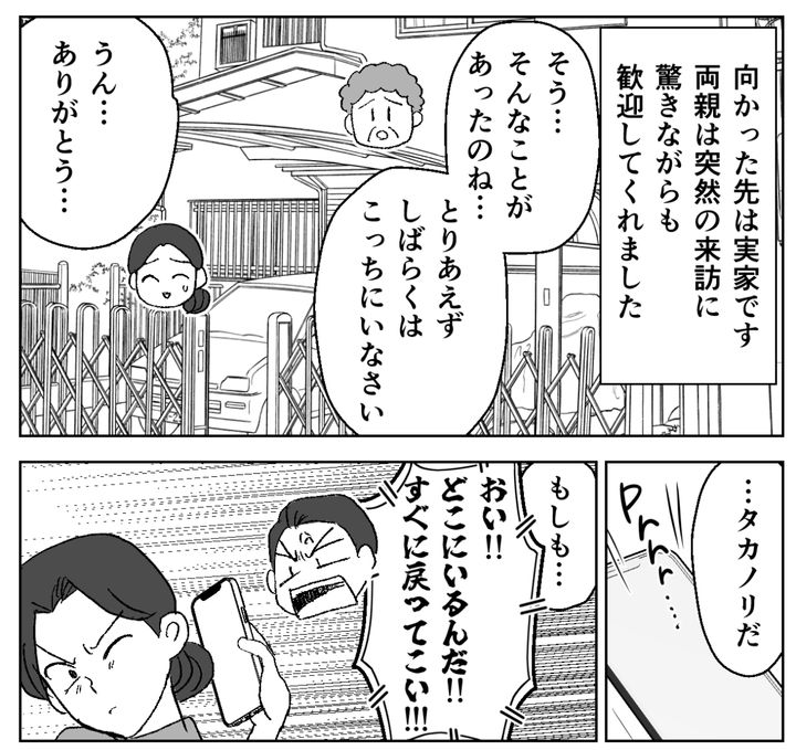 両親は突然の来訪に驚きながらも私たちを歓迎してくれました。私とハルマの表情を見て、何かを察したのでしょう。両親はハルマを「よく来たね」と抱きしめてくれました。私が今回の件を説明していると、スマホが鳴りました。運転をしているあいだは鞄の中に入れていたのでまったく気になりませんでしたが、きっと何度もかけてきていたのでしょう。私は深呼吸をして電話に出ました。