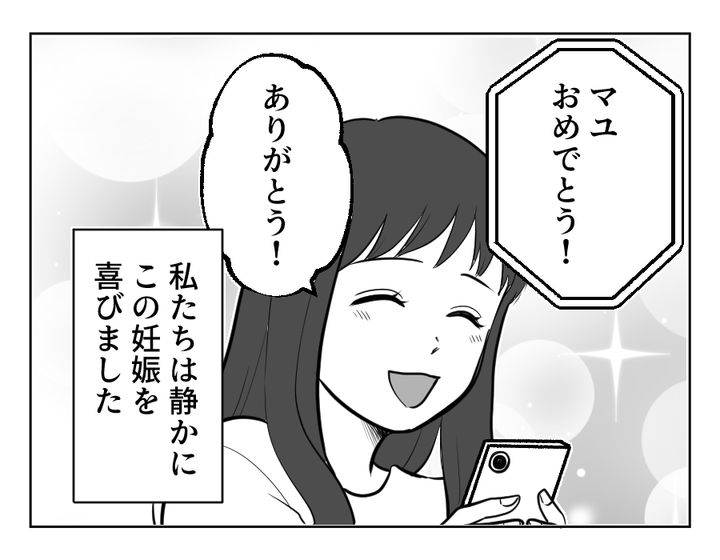 マユさん、妊娠おめでとうございます! 夫のコウヘイさんとの間に、待望の第一子のようですね。マユさんが報告をする様子や実両親の反応から、静かに、でも心から喜んでいる雰囲気が伝わってきます。「やったー!」という喜び方ではないのにはなにか理由があるのかもしれません。実両親には里帰り出産などで迷惑をかけることも多いため、少しでも早めに伝えておいた方がいいと思っての判断だったそう。そして今度は義両親からの祝福の連絡。同じく「ありがとうございます」と返すのかと思いきや、マユさんの絶望的な表情……? 義両親に知られてはまずいことが……? 気になりますね。
