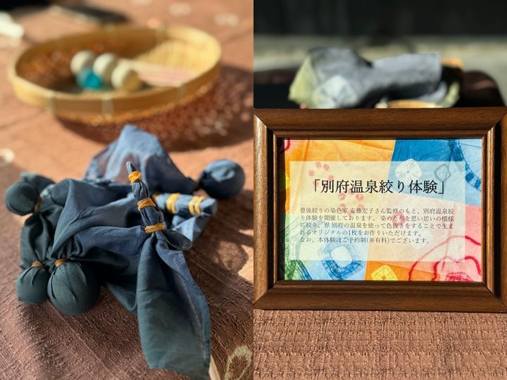 この日は、温泉の成分で布の色を抜き、模様を浮かび上がらせる伝統技法「別府温泉絞り」にトライ。輪ゴムや割り箸を使って思い思いの場所を絞ったら、温泉に浸して色を抜きます。出来上がった布には美しい模様が浮かび上がり、そのままお土産として持ち帰ることも。別府の文化と技を肌で感じられる、特別なアクティビティです。