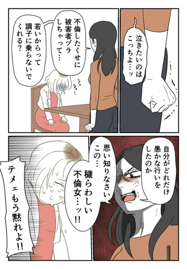 突然のできごとに、頭がついていきません。モトの妻から「家の中で話しましょう」と言われ中に入ると、「探偵を雇った」「不倫の証拠写真がある」と突きつけられたのです…。