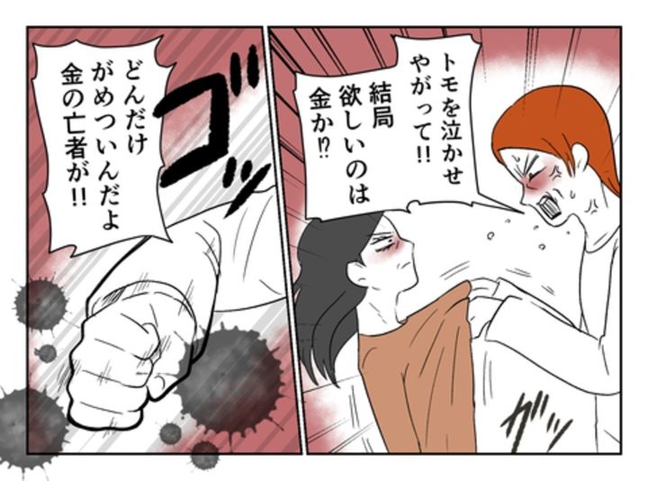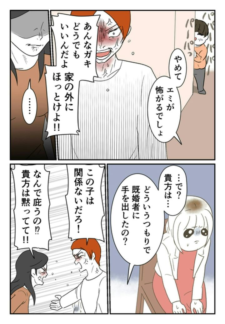 まさに修羅場…。モトの妻からは罵声をあびせられ、モトは妻に暴力を振るいます。尾持さんは、思わずその場から逃げ出してしまいます…。