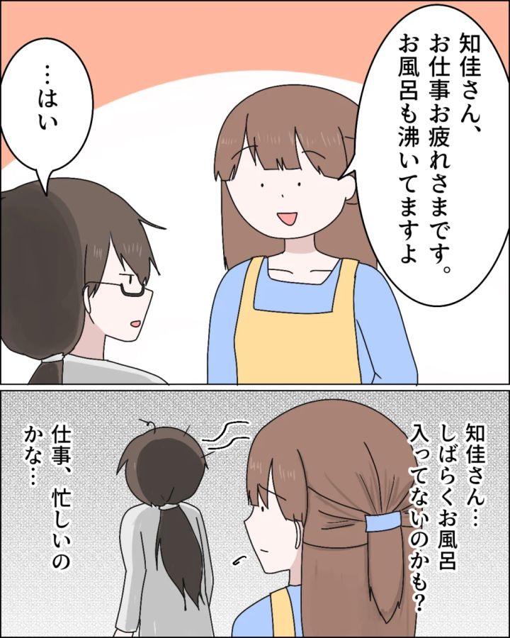 知佳さんがいつ降りてきても良いように、お風呂も準備してあったので良かった。「お仕事お疲れ様です。お風呂も沸いていますよ」と声をかけると、知佳さんは小さく「はい」と返事をして、黙ってお風呂に向かいました。しばらくお風呂に入っていない様子が私にもわかりました。仕事が忙しいのかな、体調が心配です。