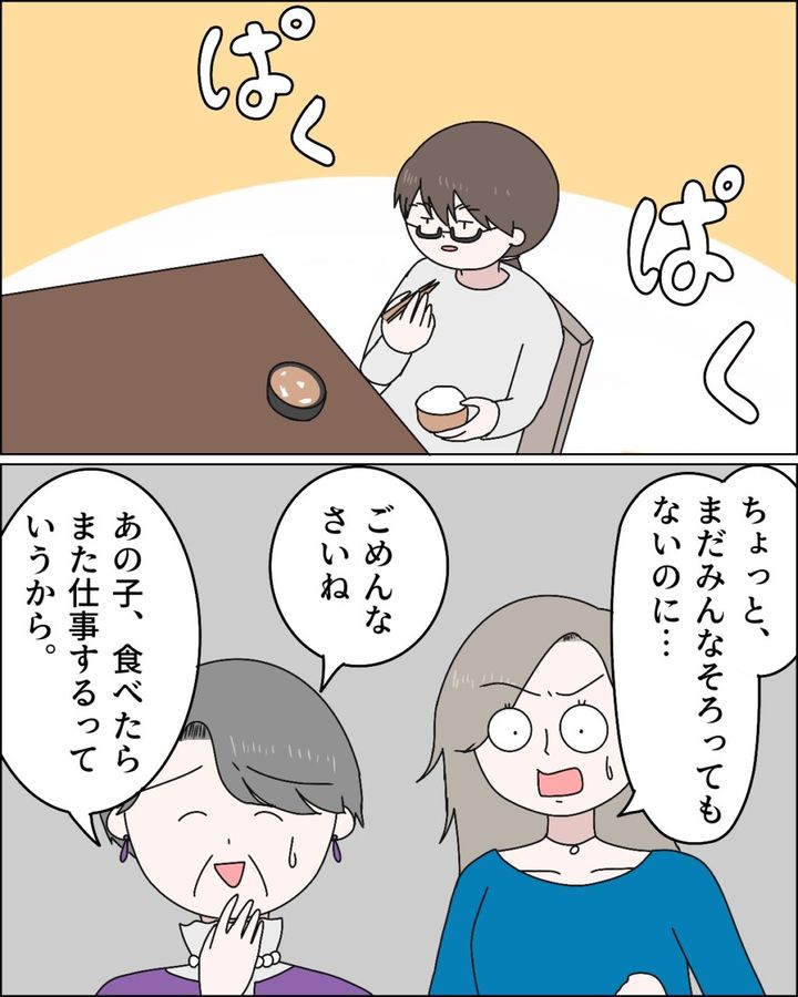 お風呂から出た知佳さんがおもむろに一人で食事を始めたのを見て、「ちょっと、まだみんな揃ってもいないのに」と驚いた麻里さんが口走りましたが、それを遮るように義母が「ごめんなさいね、あの子、食べたらまた仕事するっていうから。」と申し訳なさそうに言いました。