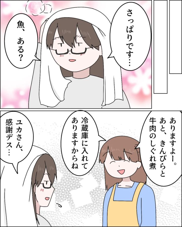 しばらくすると、いくぶん顔色が良くなった知佳さんが「さっぱりです・・・魚、ある?」とお風呂から出てきました。楽しみにしてくれている様子が嬉しくて、知佳さんのすきなきんぴらと牛肉のしぐれ煮も作ったことを伝えると、「ユカさん、感謝デス・・・」と独特の話し方。それでも喜んでくれているのは表情でちゃんと伝わりました。