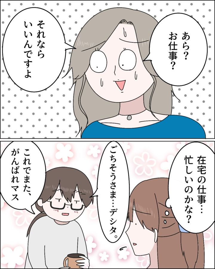 義母に言われた麻里さんは「しまった」という顔で「あら?お仕事?それならいいんですよ」と慌ててフォローしました。そんなことよりも私は知佳さんが気になりました。在宅の仕事が忙しいのかな?「ごちそうさま・・・デシタ。これでまた、がんばれマス」伏し目がちに、たどたどしい話し方で知佳さんはそう言ってまた2階に上がっていきました。
