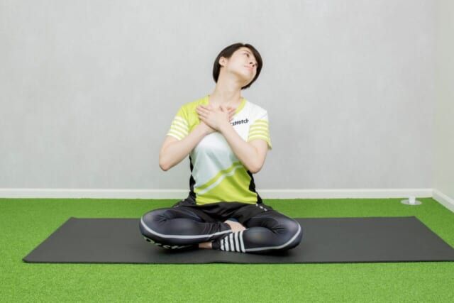 (1)あぐらをかく姿勢になり、右側の鎖骨の下(中心よりも少し右)に両手を添える