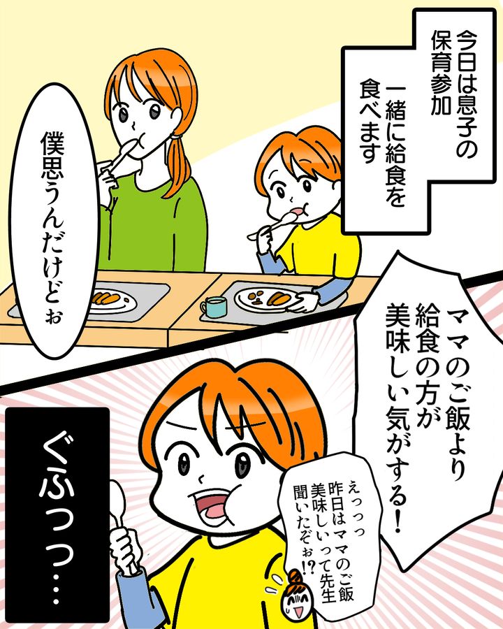 保育参観で子どもたちと一緒に給食を食べていたママ。すると「僕思うんだけどぉ……」となにやら意味ありげに口を開いた息子さん。からの痛恨の一撃!